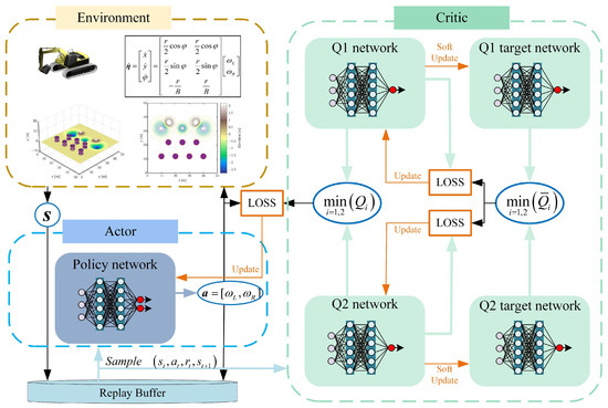 As shown in Figure 2, the Soft Actor–Critic (SAC) algorithm [24] builds upon the Actor–Critic framework by introducing a maximum policy entropy objective to address the exploration–exploitation tradeoff in reinforcement learning. By incorporating entropy into the objective function, the SAC algorithm aims to achieve a balance between reward maximization and entropy (i.e., policy randomness), thereby significantly enhancing the agent’s exploration capability and robustness.