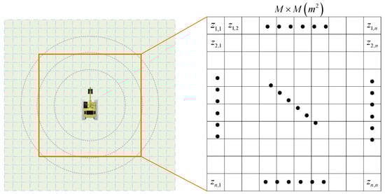 Figure 3. Local elevation information.Its mathematical description is written aswhere represents the elevation value corresponding to a grid point, as defined in Figure 3. The matrix size n is determined based on the sensor detection range M and the grid sampling resolution. - UTV’s attitude change: To implicitly learn the effects of wheel slipping on the agent’s attitude without explicitly providing a model approximation, the attitude transformation between two consecutive time steps and the corresponding actions are used as state inputs, and this is defined aswhere , , represent the attitude changes of the agent between two consecutive time steps. denotes the angular velocities of the left and right drive wheels at the previous time step.