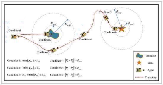 - Obstacle Avoidance Reward Design: The obstacle avoidance reward function is designed to encourage the UTV to maintain a safe distance to obstacles, thereby ensuring its safe arrival to the destination. The reward function can be expressed aswhere represents the collision threshold, which defines the minimum distance between the agent and an obstacle. denotes the safe distance between the agent and obstacles to ensure safe operation. A detailed illustration is provided in Figure 4 (see, for instance, Conditions 1–3 in the figure).