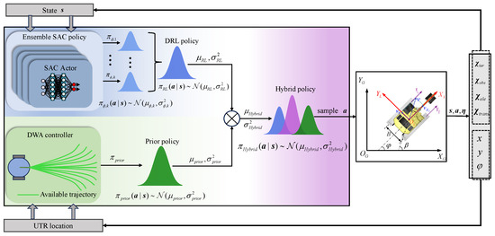 The SAC-HP framework. The hybrid policy generates the hybrid action directly via a combination of the DRL policy based on SAC and the classical (prior) policy based on DWA controller. The DRL policy is obtained by using an ensemble SAC policy that is a mixture of a single SAC policy with state as an input, which is defined in Section 3.1. The DWA controller uses the UTV’s position as inputs.