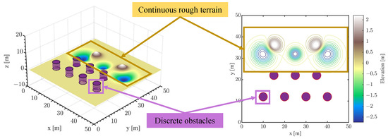 The simulation area (i.e., ) with unstructured obstacles was configured as shown in Figure 6. Purple cylindrical shapes represent discrete binary obstacles, while the contour regions indicate continuous rugged terrains. Assuming that the UTV will encounter random slipping disturbances within the rugged terrain areas, the task objective is to enable the UTV to navigate from the blue starting point to the red endpoint. The experimental configuration parameters and SAC training hyperparameters are listed in Table 2 and Table 3, respectively. Notably, the maximum rotational speed of the UTV’s left and right drive wheels is .