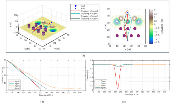 Performance of extend state space. (a) The planned trajectories of the agents. (b) The temporal variation in the distance between the UTV and the target point. (c) The elevation values of the UTV’s position at each time step.