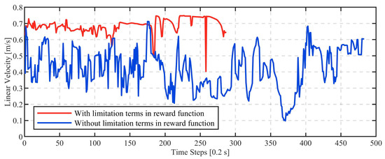 To validate the influence of the in the reward function (24), we recorded the linear velocity curve over time during the driving stage. Figure 8 illustrates the velocity outputs of two agents (i.e., one trained with and the other without) during the driving stage. Both agents were trained using the complete state space, with random slip disturbances introduced in the environment (i.e., same as the configuration of Agent 4 described in Section 5.2). As shown in Table 5, when was included in the reward function, the UTV reached the destination at the 287th time step, with an average linear velocity of 0.69 and a variance of 0.0019 (i.e., represented by the red curve). In contrast, when was excluded, the UTV took 483 time steps to reach the destination, with an average linear velocity of 0.42 and a variance of 0.0152 (i.e., represented by the blue curve). The experimental results indicate that the energy optimization term in the reward function (24) significantly reduces velocity oscillations in the UTV, enabling it to operate more smoothly and at higher speeds.