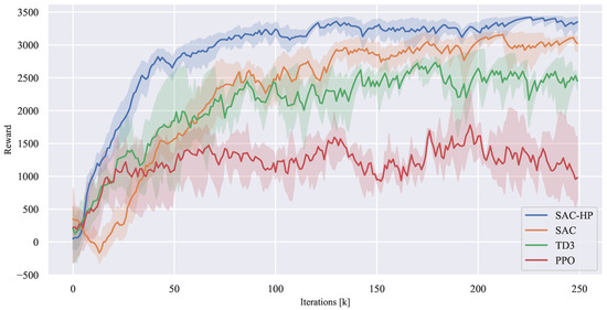 In addition, real-world deployment remains a major challenge for DRL-based methods. Potential remedies such as domain randomization [33], noise injection during training [34], and human-guided RL [35] may help close the simulation-to-reality gap. Moreover, robust sensor fusion using IMU, LiDAR, and visual input can enhance policy generalization under uncertain terrain conditions [36,37]. Future extensions of SAC-HP will integrate these mechanisms to facilitate more reliable and scalable deployment in the field.