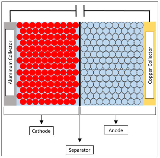 Lithium-ion batteries are utilized in various applications, ranging from electronic devices and cell phones to mobility equipment and electric vehicles [18]. Their usage accounts for approximately 88% of the energy consumption of equipment requiring a battery [19]. Lithium-ion batteries consist of a cathode, an anode, an electrolyte, and a separator [10]. The cathode and anode serve as the two electrodes, with the cathode (+) made of lithium oxide and an aluminum collector, while the anode (−) comprises a copper collector and graphite, a material that can hold lithium atoms between its layers [20]. The electrolyte can be a liquid, gel, ceramic, or polymer made from lithium salts and organic solvents, capable of transporting lithium ions. The separator is constructed from polymers [10,20]. Figure 1 presents a simple structure of a lithium-ion battery.