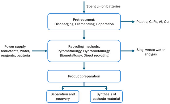 General scheme with process and recycling methods for spent li-ion batteries. Adapted from [34].