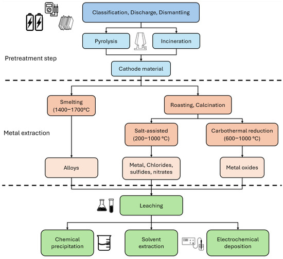 Pyrometallurgy works with different cathode materials, techniques applied, and process conditions [40,56].