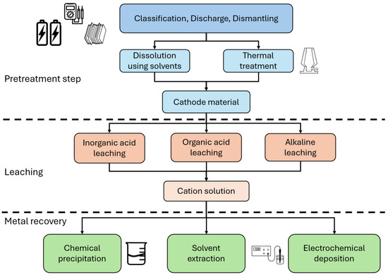 Hydrometallurgy is one of the most promising and widely adopted approaches for recovering valuable metals from spent lithium-ion batteries (LIBs), primarily due to its high metal recovery efficiencies and product purities [34]. The hydrometallurgical recycling process involves dissolving battery components in chemical solutions, enabling the extraction of materials for reuse [38]. Figure 4 shows a general scheme of the hydrometallurgical recycling process. To carry out the process, complex pretreatment is necessary, which includes disassembling, crushing, and separating components for optimal application. Additionally, during the pretreatment process, the electrolyte is lost through solvent dissolution, while other materials are sorted and separated. In this step, plastic is separated from metals and sent for recycling [10]. After pretreatment, the leaching process is applied, where the metal compound is chemically attacked. In this process, metals trapped in solid compounds are released through chemical reactions [10]. Then, each of the metals is extracted separately, using different solvents applied to the mixture or by precipitation [18]. The following metals can be extracted with a high degree of purity: nickel (Ni), cobalt (Co), manganese (Mn), copper (Cu), lithium (Li), and aluminum (Al) [10].
