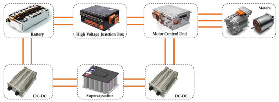 The test platform employs a dual-energy storage system consisting of a power battery pack and a supercapacitor, as illustrated in Figure 3. This system includes a power battery pack, a supercapacitor, two DC/DC converters, and a two-channel high-voltage contactor. The power battery pack is connected to the motor power converter via the high-voltage contactor, while the supercapacitor is connected to both the power battery pack and the motor power converter through the two DC/DC converters, respectively.