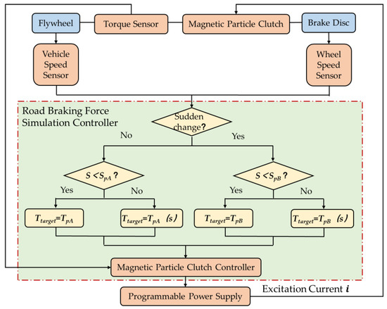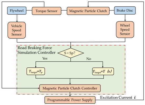 In Figure 6, represents the resultant braking torque (hereafter referred to as the equivalent braking torque), which is the sum of the brake torque and the motor regenerative braking torque , expressed as . The torque transmitted by the magnetic powder clutch is denoted as , while corresponds to the actual braking torque exerted on the flywheel. During the experimental process, the equivalent braking torque is transmitted to the flywheel through the magnetic powder clutch. When is less than the maximum transmissible torque of the magnetic powder clutch, the clutch operates in a rigidly connected state. Under this condition, the entire equivalent braking torque is transferred to the flywheel, resulting in flywheel deceleration, i.e., . However, when exceeds , the wheel enters an anti-lock regulation state. In this scenario, the system dynamically adjusts the torque transmitted by the magnetic powder clutch based on the relationship between the longitudinal adhesion force and the slip ratio of the selected road surface, thereby simulating the dynamic variations in ground braking force.