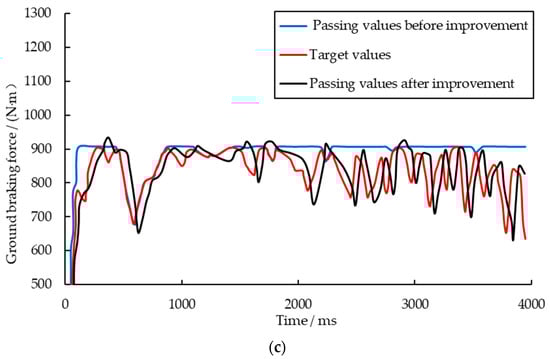 This study resolves a critical challenge in electromechanical brake system validation: conventional ABS/RBS integrated platforms’ inability to dynamically simulate tire-road adhesion characteristics during braking. We propose a fuzzy adaptive PID-controlled magnetic powder clutch (MPC) system that achieves ground braking force simulation synchronized with slip ratio variations. The innovation encompasses: (1) Dynamic torque calculation model incorporating the curve characteristics of longitudinal friction coefficient () versus slip ratio (), (2) Nonlinear compensation through fuzzy self-tuning PID control, and (3) Multi-scenario validation platform. Experimental validation confirms superior tracking performance across multiple scenarios: (1) Determination coefficients R2 of 0.942 (asphalt), 0.926 (sand), and 0.918 (snow) for uniform surfaces, (2) R2 = 0.912/0.908 for asphalt-snow/snow-asphalt transitions, demonstrating effective adhesion characteristic simulation. The proposed control strategy achieves remarkable precision improvements, reducing integral time absolute error (ITAE) by 8.3–52.8% compared to conventional methods. Particularly noteworthy is the substantial ITAE reduction in snow conditions (236.47 vs. 500.969), validating enhanced simulation fidelity under extreme road surfaces. The system demonstrates consistently rapid response times. These improvements allow for highly accurate replication of dynamic slip ratio variations, establishing a refined laboratory-grade solution for EV regenerative braking coordination validation that greatly enhances strategy optimization efficiency.
