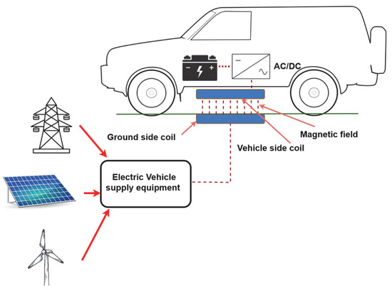 This paradigm shift toward intelligent hybrid systems is epitomized by wireless power transfer (WPT), which transcends the technical trade-offs by merging high-efficiency charging with seamless user experiences. WPT is emerging as an optimal solution for accelerating the adoption of EVs, combining charging simplicity (contactless charging) and enhanced safety (no handling of voltage-carrying cables) [11]. Scientists are taking particular interest in this, as demonstrated by recent advances in energy efficiency and integration into urban infrastructures [12]. Standards such as SAE J2954 [13] play a key role in guaranteeing interoperability between all types of vehicle, from urban cars to commercial vehicles, with power ratings from 3.7 kW to 22 kW while ensuring the optimum adaptation to the varied needs of users. Figure 1 illustrates a wireless charging system composed of two key sub-assemblies: (1) the primary part or the Ground Assembly, integrating coils powered by the traditional electrical grid and/or renewable sources (solar, wind), and (2) the secondary part or the Vehicle Assembly, comprising the coils on board the vehicle [14,15]. Energy transfer is performed wirelessly via a high-frequency magnetic field of 85 kHz generated by magnetic resonance, in compliance with the SAE J2954 standard for optimized efficiency and safety. This system supports advanced functionalities such as Vehicle-to-Grid (V2G) and Grid-to-Vehicle (G2V), enabling bidirectional energy management, as well as Vehicle-to-Vehicle (V2V), an emerging technology enabling energy transfer between vehicles [16]. Versatile, this WPT can power not only electric vehicles EVs but also aerial drones, autonomous submarines, and other mobile applications, paving the way for a universal, sustainable energy infrastructure [17,18]. In this context, recent research has demonstrated significant progress in wireless in-flight charging for drones, addressing unique challenges distinct from EV applications [19]. Key innovations include solutions for dynamic mutual inductance disturbances, lightweight receiver design, and constant-power (CP) delivery under large air gaps. Notably, Ref. [20] proposed a self-oscillating WPT system with autonomous on–off keying modulation (AOKM) on the primary side, eliminating the need for pickup-side DC-DC converters or wireless communication. This approach extends the CP range by 62.4% while maintaining a 73.8 W output at 88.3% efficiency, even under misalignment. Meanwhile, Ref. [21] systematizes the field by categorizing existing challenges (e.g., fast charging, coil weight constraints) and emerging solutions, such as adaptive frequency tuning and hybrid transmitter topologies. Together, these studies highlight the potential of lightweight, high-flexibility WPT systems to overcome drone endurance limits, with implications for future standardization and cross-application synergies (e.g., shared SAE J2954 frameworks for EVs and drones).