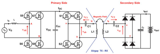 The analysis and modeling of the system are restricted to the portion between the DC bus and the battery , intentionally excluding the power factor correction (PFC) stage connected to the grid. This simplification is made to focus on the core components directly involved in the WPT process, such as the inverter, the resonant compensation network, the coupling coils, and the rectifier. Including the PFC stage would introduce additional complexity related to grid interaction and AC-DC conversion, which lies outside the primary scope of this study. Moreover, the PFC circuitry does not significantly influence the resonant behavior, control strategy, or power transfer efficiency of the WPT link itself. Therefore, isolating the analysis to the DC-side stages allows for a more targeted investigation of the system’s performance and dynamic characteristics relevant to wireless EV charging.