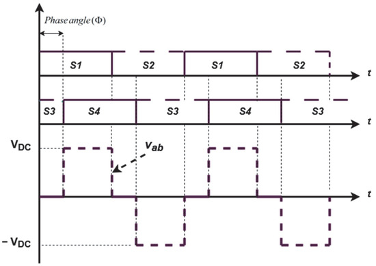 For WPT systems using HF inverters, phase shift control is commonly employed to regulate the output power. On the primary side, the full-bridge inverter generates a square-wave voltage, as shown in Figure 3, whose output can be expressed as a periodic signal. This square-wave voltage is decomposed into a Fourier series to analyze its frequency components. Since the resonant circuit is designed to operate at a specific resonant frequency of 85 kHz, the fundamental component of the inverter output—at this frequency—is the most significant for power transfer, while the higher-order harmonics are largely attenuated. The phase shift angle between the bridge legs directly affects the amplitude of this fundamental component. The square-wave output voltage with the phase shift can be expressed as a Fourier series:
