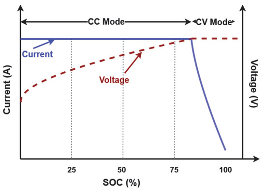 CC-CV has always been the reference charging method for li-ion batteries. Figure 4 shows this classic charging method, which consists of two phases. In the first phase, the battery is charged at a CC until the voltage reaches its maximum value. In the second phase, the lithium-ion battery is charged at a CV until the current reaches a preset value, known as the cut-off current value. The CC for charging always has an impact on the charging rate, but the CV for charging and the value of the cut-off current define the capacity of the charged battery. This charge rate depends on the internal chemistry of the batteries. But increasing the charging current too much will have a negative effect on the batteries’ SOH. Furthermore, the CV mode requires a longer charging time and contributes a little to the charge. This CV mode depends entirely on the temperature and the level of degradation of the battery [35,36]. In addition, high charging currents limit the normal diffusion process in the electrodes, which in turn degrades the battery capacity and performance. Added to this is the possibility of lithium plate deposition in batteries at high charge currents, especially at low temperatures or a high SOC. Also, from a chemical point of view, lithium ions concentrate on the surface of the anode and are rapidly transformed into lithium metal due to the fact that the ion diffusion on the surface is faster than that inside the material. This phenomenon, known as lithium plating, has a drastic impact on the life cycle and performance of batteries. This is why several studies have been carried out to reduce the formation of lithium plating on the anode surface; to reduce the increase in cell temperature; and, at the same time, to reduce battery degradation [37,38].