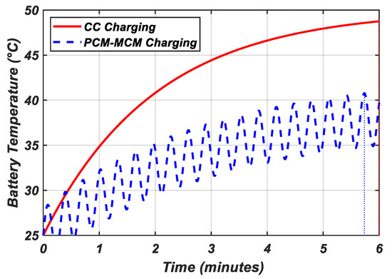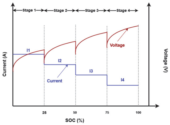 One of the most important ways to overcome the battery range anxiety that has slowed the widespread adoption of EVs is through fast charging. In addition to increasing the charging efficiency, decreasing charging times, extending battery life, and improving the safety of li-ion batteries, developing a charging strategy is crucial for enhancing the EV user experience. MCC charging is one of the key charging techniques that can handle the aforementioned issues. The MCC charging strategy divides the CC during charging into many currents with decreasing C rates in accordance with the battery charging standards. As illustrated by Figure 5, during continuous charging with a high current, the decreasing CC rate significantly reduces the precipitation of lithium from the battery’s negative electrode. Furthermore, the MCC charging approach allows the CV charging stage to be pushed through, as opposed to the CCCV strategy. As a result, many researchers are very engaged in the MCC charging approach [23,39]. The authors of [38] found that a four-stage charging methodology is more effective than the usual CC-CV method in terms of decreasing charging times and increasing the charging and discharging capacity. To ascertain the ideal C rate for four-stage charging, the authors of [39] carried out tests. The scientists found that the ideal four-stage charging minimizes charging times, prolongs li-ion batteries’ lifetimes, and boosts the charge capacity without raising the temperature, as compared to the usual CC-CV charging technique.