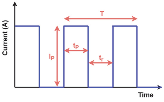 The frequency is . The amplitude of the positive pulses is . The durations of the positive pulsed current and of the relaxation period are and , respectively. Then, the duty cycle of the PCM mode is defined as follows: