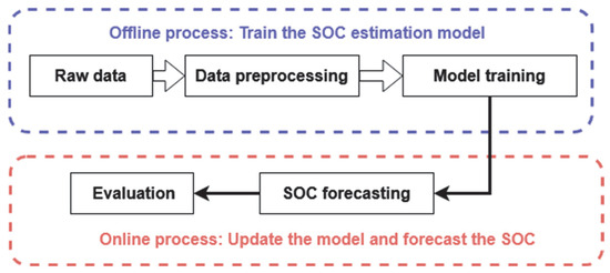 An ANN model, as compared to mathematical models, is a more adaptable method that may be used in a variety of situations. Figure 8 depicts the entire procedure. The two primary stages of the suggested model are (1) offline, which concentrates on training the SOC estimate model, and (2) online, which uses the trained model to forecast the SOC. Data collection, data preprocessing, and model training are examples of offline procedures. Every step in the offline procedures was completed just once. Simultaneously, the online procedures include a performance evaluation and SOC forecasting using new real battery data.
