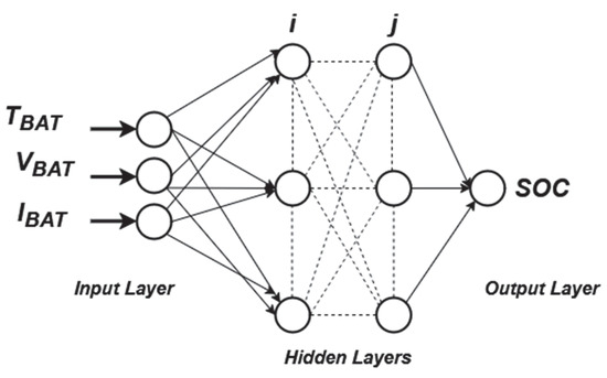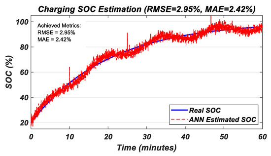 To apply the hybrid charging method, the change in the current’s value must either be time-dependent or SOC-dependent. For the optimum charging, the change must be made as a function of the SOC because charging time is not a fixed and reliable factor, especially as the battery begins to age. To control the charge of the battery in hybrid PCM-MCM mode, ascertaining the real SOC of the battery is essential. For li-ion batteries in EVs to be safe, effective, and long-lasting, accurate SOC estimates are essential. The conventional techniques for estimating the SOC, such as coulomb counting and model-based methods, frequently have drawbacks such as error compounding, sensitivity to the starting conditions, and reliance on the exact battery specifications. Because they can simulate intricate nonlinear interactions between the battery’s operational parameters (such as voltage, current, and temperature) and SOC without requiring explicit knowledge of the internal battery dynamics, ANNs have emerged as a possible alternative. Without depending on direct SOC measurements, we will employ an ANN-based SOC estimating method in this work that uses just voltage and current data. This is due to the fact that direct SOC measurements might be costly and challenging to acquire. As a result, it is beneficial to estimate the SOC using indirect measurements, including the voltage and current signals, which are simple to acquire using an embedded program [43,44].