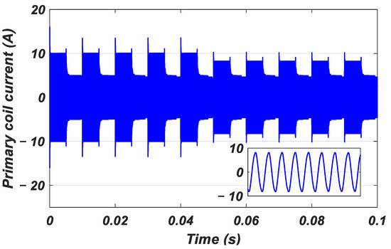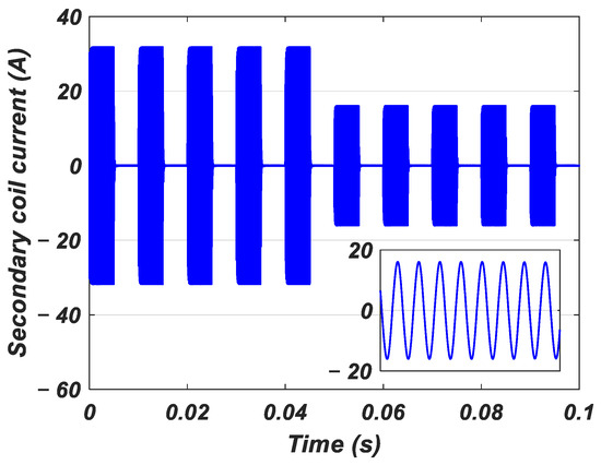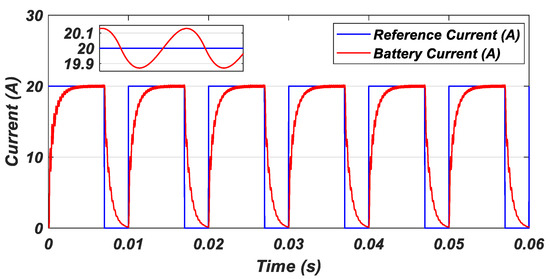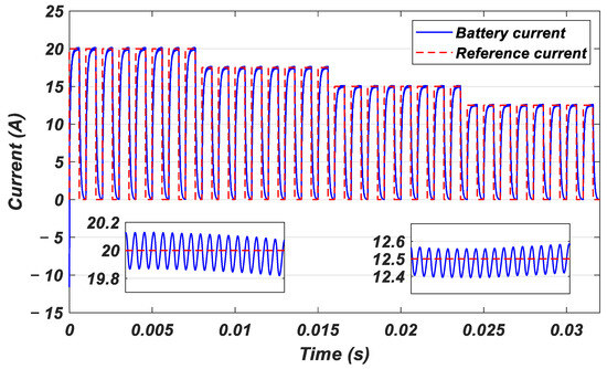 Figure 32 shows the results for case 1, where the charge current perfectly follows the reference without any overshoot, confirming the robustness and reliability of the proposed control method. This precision demonstrates the effectiveness of the MA-based PI controller in regulating the system despite dynamic variations in the magnetic coupling, guaranteeing exceptional stability under nominal conditions of a fixed air gap and perfect alignment. The absence of oscillations or tracking errors validates the controller’s ability to maintain the optimum performance with a response time <100 ms, essential for demanding industrial applications such as fast charging for EVs. These results underline the key advantage of our approach.
