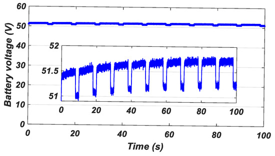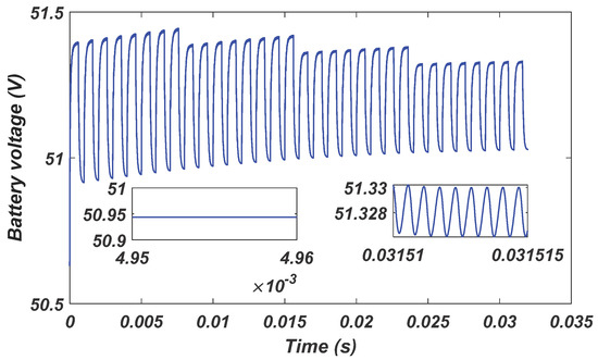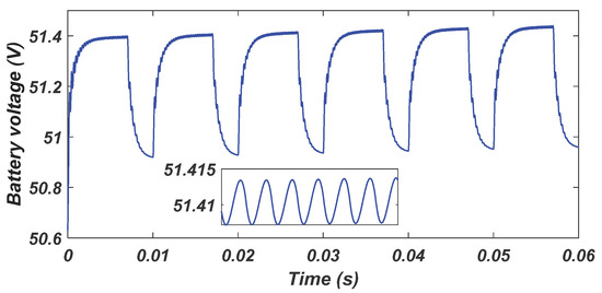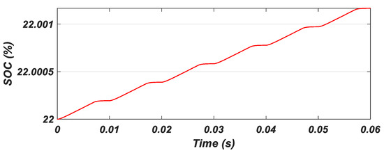Figure 35 shows the average DC bus current as a function of time, highlighting its close correlation with variations in the battery current. It can be seen that the DC bus’s current closely follows the fluctuations in the battery charge current, reflecting the dynamics of the energy transfer between the WPT system and the battery. This match confirms the controller’s effectiveness in regulating the power in real time, particularly during transitions between different operating modes. The DC bus current’s peaks and troughs correspond to the battery current adjustments imposed by the MCM-PCM hybrid charging strategy, validating the system’s stability even under variable demand profiles.