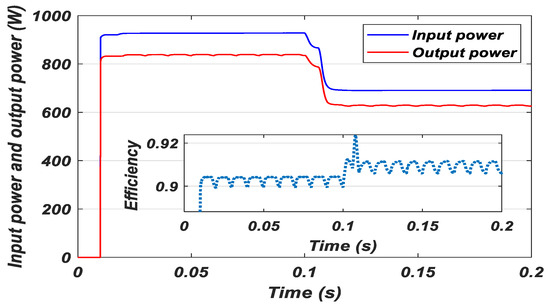 Figure 36 shows the input DC bus and output battery power profiles in the proposed hybrid charging system using a S-S compensation topology. The results show an average efficiency of 90%, confirming the suitability of this approach for high-power applications. The DC bus’s input power shows controlled variations linked to the transitions between MCM steps (dynamically adjusted constant currents) and PCM sequences (fixed-frequency pulses, e.g., 100 Hz, duty cycle = 70%). The peaks also correspond to changes in the charging mode. The battery’s output power remains stable thanks to the active regulation enabled by S-S compensation and the MA controller, which guarantees wireless energy transfer at a constant frequency of 85 kHz and minimizes the losses through optimized magnetic resonance with a high Q factor.