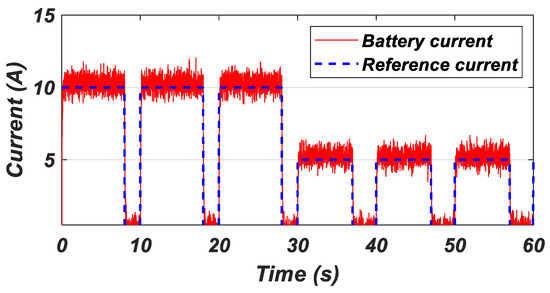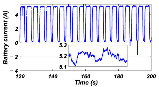 A number of researchers have suggested the pulse charging technique as a way to reduce the charging time, lower the temperature rise, and increase battery lifespans [40]. Depending on the current’s frequency, amplitude, and duty cycle, there are various kinds of current pulses [27]. In the literature, a number of pulse charging patterns have been proposed as alternatives to CC-CV charging. The basis for pulse charging is the periodic fluctuation in various current pulses with varying current directions and rates. For a predetermined amount of time, the charging current can be stopped, raised, lowered, or substituted with brief discharging pulses. The most common pulse charging method is positive pulse current (PPC) with some relaxation periods, as shown in Figure 6. The design parameters are the peak charging current, the time ON of the pulse, the relaxation interval time, and the pulse’s total period. PPC can increase the batteries’ lifetime by 105% at a high frequency (2 kHz) and by 60% at a low frequency (0.05 Hz) [41].