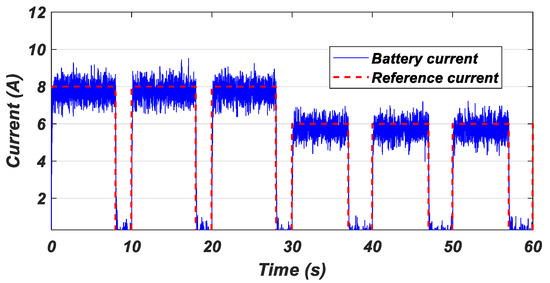 Figure 33 shows the performance of the control strategy in case 2, characterized by a coil misalignment of Δx = Δy = 10 cm and an air gap extended to 160 mm, conditions representative of the challenges encountered in real-life environments. Despite these disturbances, the MA-optimized controller maintains robust reference current tracking, with a maximum error of less than 5% and no major instabilities. These results highlight the system’s ability to adapt to variations in the magnetic coupling, preserving WPT in this degraded scenario even with low efficiency. This resilience confirms the applicability of the method to non-ideal wireless charging infrastructures, where positioning imperfections and increased distances are frequent.
