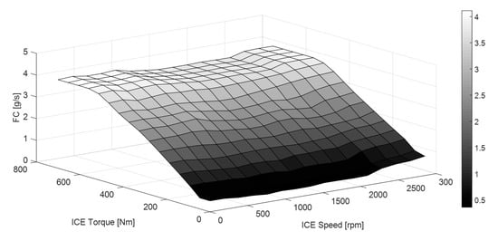 It is usually represented by an appropriate two-dimensional lookup table, instead of an analytical model. Studies to create dynamic models for calculating fuel consumption can be found in the literature. It was proposed in [] to determine fuel consumption, , measured in liters per 100 km via the following equation: