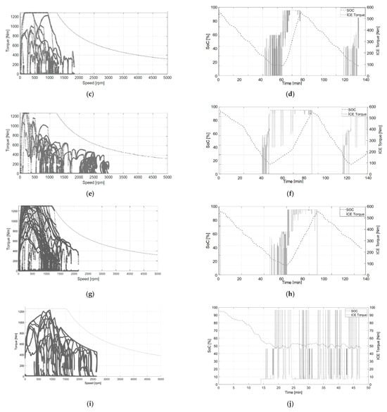 Shows all drive cycles and operating points of EM and (a,b) NREL, (c,d) FTP-SC03, (e,f) FIGE, (g,h) Orange cycle, and (i,j) WLTP cycle EM operation point and SOC, respectively.