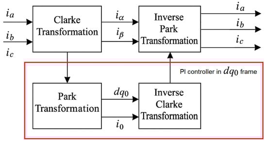 To implement the control strategy and to form the PWM control signals for the IGBT modules, a synchronous rotating reference frame (dq0) was employed. This frame allows for the decoupling of the active and reactive components of the current, facilitating the implementation of PI-regulators with an improved dynamic response. The αβ reference frame was initially used as an intermediate stage via the Clarke transformation, followed by the Park transformation into the dq0 domain. This approach enables effective current control under varying load and battery conditions. The reverse transformation is applied before signal generation for PWM modulation.