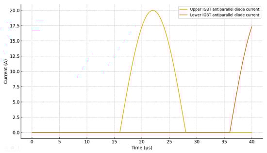 Figure 11 illustrates the conduction of the freewheeling diodes when the corresponding IGBT transistor is turned off. The current peaks correspond to the commutation intervals, demonstrating how the diodes temporarily conduct the load current before the opposite transistor is activated. This behavior is critical for limiting voltage overshoots and ensuring correct energy circulation in the TPCS inverter (for one cycle of PWM at a frequency of 25 kHz, the period ~40 mks).