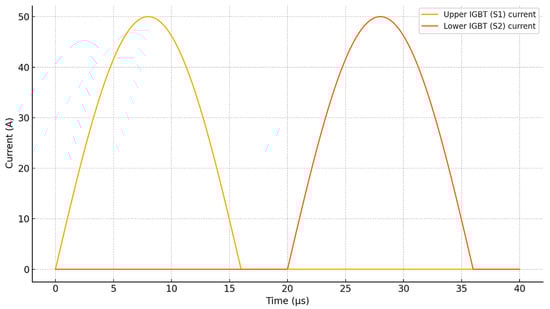 Figure 12 shows the conduction intervals of the main switching transistors. The upper IGBT conducts during the first half of the PWM cycle, while the lower IGBT conducts during the second half. The sinusoidal shape of the current reflects the modulation and transient switching dynamics. These curves are essential for understanding the distribution of conduction losses and thermal loading on the power devices (with a current amplitude of up to 50 A).
