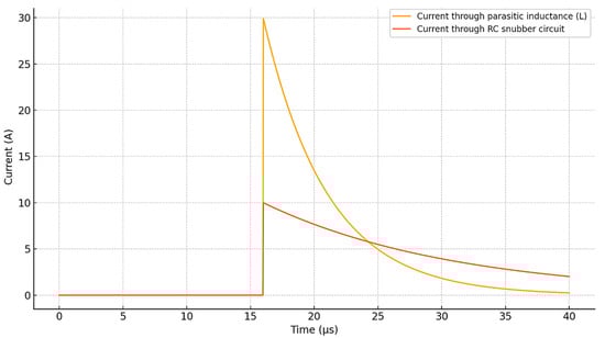 Figure 13 demonstrates a pronounced current spike through the parasitic inductance immediately after switching, followed by rapid decay within approximately 5 μs. Simultaneously, the RC snubber absorbs a portion of this transient energy, resulting in a smaller amplitude current that decays more gradually. This behavior confirms the role of the snubber circuit in damping overvoltage oscillations and protecting the IGBT modules from excessive voltage spikes. The plot in