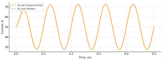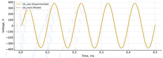 The temporal alignment of the voltage and current waveforms confirmed the correct phase relationship and realistic power factor of approximately 0.98 during steady-state operation. This close correspondence between simulated and experimental AC-side parameters provides further evidence of the adequacy of the developed mathematical model in terms of the output charging characteristics and in relation to the electromagnetic behavior of the system under real operating conditions (