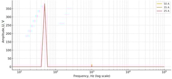 Figure 16 shows the frequency spectra of the output voltage of the alternating current for all three stages of charging. A decrease in the charging current led to a decrease in the amplitude of the fundamental harmonics at 10 kHz and the harmonics associated with them of a higher order, which confirms the ability of the model to capture the dynamic effects of switching. These results confirm the mathematical representation of the inverter and management strategies implemented in the modeling environment.