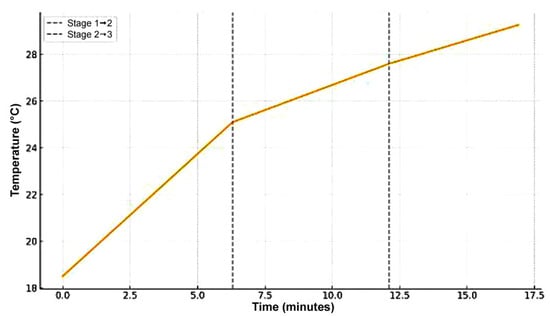 The effectiveness of the 3PT/PN charging algorithm in managing thermal dynamics was confirmed by real-time temperature measurements. Throughout the charging process, the battery temperature increased gradually from an initial value of 18.5 °C to a maximum of 29.3 °C at the end of the third stage. The temperature remained well below the critical threshold of 40 °C during all three phases of charging. The temperature rise was most prominent during the first stage (50 A), reaching approximately 25.1 °C by the end of the 6.3 min interval. During the second stage (35 A), the rate of the temperature increase slowed, with a final value of about 27.6 °C after 5.8 min. At the third stage (25 A), the temperature rose only slightly, stabilizing at 29.3 °C. These data demonstrate that the proposed charging algorithm maintains a safe thermal profile and confirms its suitability for practical applications. The corresponding temperature–time curve is presented in the