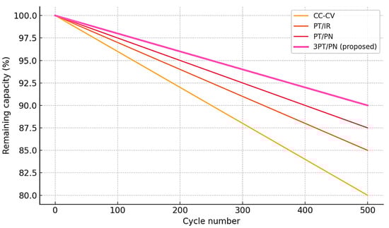 0) depending on the number of cycles to 500. It can be seen that the battery charged according to the standard CC-CV protocol loses the capacity of all those that are fastest: already by 300, the cycle remains at 80% of the initial capacity. Impulse techniques demonstrate a slower degradation—for example, about 85% (PT/IR) and 88% (PT/PN) from Q