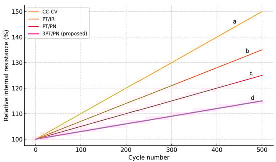 Figure 21 illustrates the growth of internal resistance as cyclical. The 3PT/PN algorithm demonstrates the minimum growth of internal resistance, which indicates a shorter increase in passivating layers (SEI) and a lower deterioration in the interfaces’ conductivity. On the contrary, with a standard CC-CV there is a thicker SEI and strong adverse reactions lead to a significant increase in resistance.