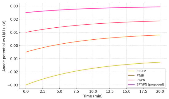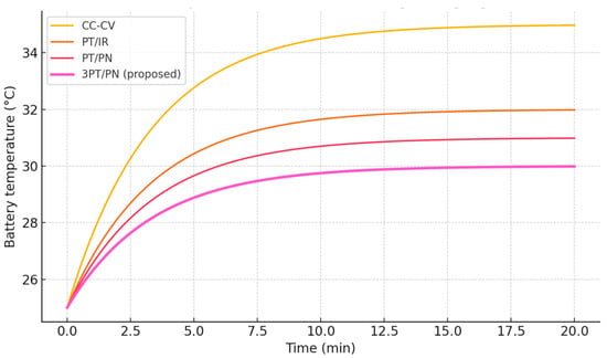 Figure 18. It is easy to notice that 3PT/PN provides faster charging, comparable to pulsed methods, with the moderate heating of the battery. A text analysis under the figures will emphasize that our algorithm combines the advantages of impulse techniques—high speed and effective depolarization—with temperature control. For example, 3PT/PN reaches a full charge faster than the standard CC-CV (by eliminating the delays in the phase of the dose), while the maximum temperature is lower by 10–15%. Thus, a comparative analysis convincingly shows the advantages of the proposed 3PT/PN algorithm over alternative approaches.