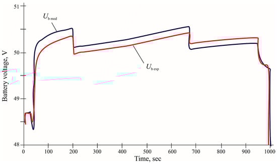 The reasons for these deviations are, first of all, delays in the actuation of the control system, which under experimental conditions average 850–950 ns, depending on the stage of charge. Especially pronounced deviations are observed during the transition between charging phases, when the control action must be corrected according to a predetermined voltage and temperature threshold. Additional discrepancies are due to the limitations of the Shepherd method used in the battery voltage simulation. Despite the fact that the modified model takes into account the temperature dependence and nonlinear change in polarization resistance, it does not always adequately reproduce the behavior of the battery in transient modes, where significant current gradients (up to 20 A/s) cause a redistribution of potentials at the interface of the electrodes and the electrolyte. In the simplified model, such effects are expressed as local voltage peaks or drops, which do not find direct correspondence in the experimental curves.