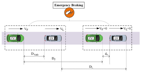 We use to indicate the maximum braking deceleration of vehicles, to represent the FV’s initial speed, and to denote the LV’s initial speed. Therefore, , and the safety distance