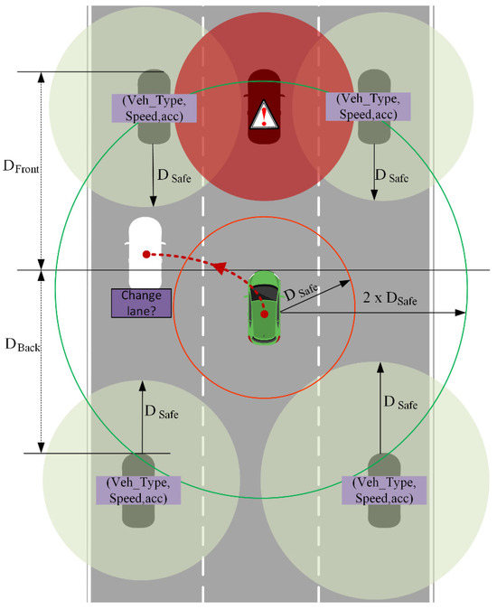If the vehicle in front of the subject vehicle is an HV, the next step is to check the HV’s deceleration. The threshold of the preceding HV’s deceleration is set as 2 in this paper, and when the preceding HV’s deceleration is greater than or equal to 2, there is a potential for abnormal conditions. Therefore, when the preceding HV’s deceleration is greater than or equal to 2, and at the same time, the distance between the subject vehicle and the preceding HV is greater than twice the safe distance, the subject vehicle will consider changing lanes to avoid collisions. When the preceding HV’s deceleration is greater than or equal to 2, and the distance between the subject vehicle and the preceding HV is between a safe distance and twice the safe distance, the subject vehicle will continue to follow the preceding vehicle at speed and detect the surrounding lanes to look for lane change opportunities. When the preceding HV’s deceleration is greater than or equal to 2, and the distance between the subject vehicle and the preceding HV is within a safe distance, there is no chance to change lanes, so the subject vehicle will directly decelerate to avoid collisions. When the preceding HV’s deceleration is less than 2, the subject vehicle will continue to follow the preceding vehicle at speed .