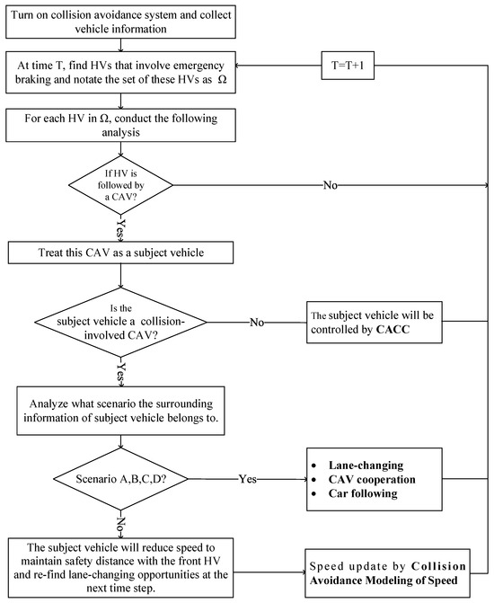 Figure 3 shows the flowchart of the proposed collision avoidance model. The collision avoidance model is activated when an HV initiates an emergency braking operation. The model is implemented by controlling the collision-involved CAVs. If the distance between the HV and its following CAV is more than double the safety distance, this CAV will be a collision-involved CAV. For non-collision-involved CAVs, this study models them using the CACC approach.
