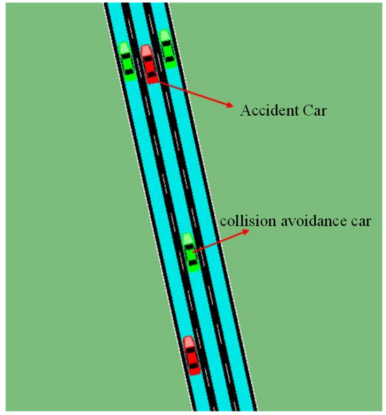 A detector is set up on each of the three lanes to measure the number of vehicles entering the lane, the number of vehicles leaving the lane, the average speed, and the running time loss. Figure 4 depicts a collision avoidance scenario in a SUMO simulation, where the red car denotes an HV and the green car represents a CAV. When the HV in front of the collision-avoidance-involved CAV encounters an accident, the CAV will adjust its behavior based on the proposed collision avoidance model.