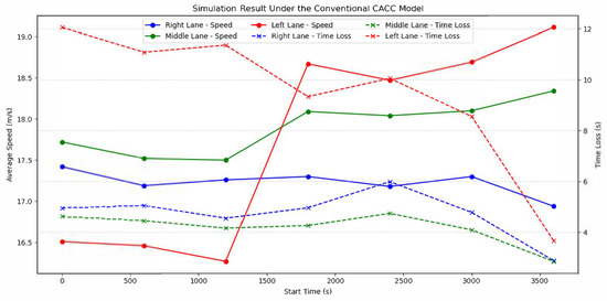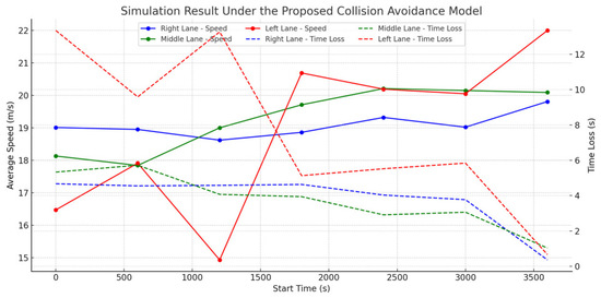 After SUMO simulations, the number of vehicles entering the lanes, the number of vehicles leaving the lanes, the average speed, and the time loss of the proposed collision avoidance model and the CACC model are obtained. Figure 5 shows the simulation results under the conventional CACC model, Figure 6 presents the simulation results under the proposed collision avoidance model, and Figure 7 compares the performance of the two models.