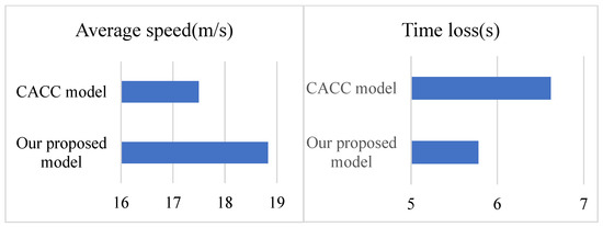 As can be seen from Figure 7, the average vehicle speed of the collision avoidance model is greater than that of the CACC model, and the average time loss of the collision avoidance model is less than that of the CACC model.