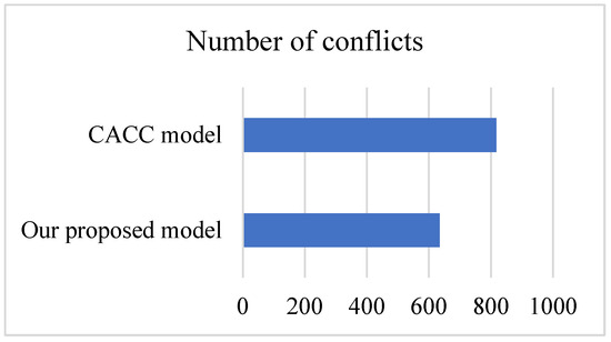 According to the records generated by the SSM device, the total number of conflicts under the CACC model is 817, and the total number of conflicts under the proposed collision avoidance model is 635, the comparison of the two models is shown in Figure 8. The experimental results indicate that the proposed collision avoidance model benefits not only traffic efficiency but also road safety.
