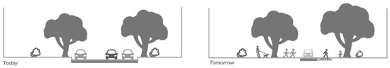 Stead and Vaddadi [20] argue that the widespread adoption of AVs across the United States could substantially transform existing street configurations. Specifically, if AVs were fully implemented nationwide, approximately 6.63 million kilometers of sidewalks could potentially be widened to 9.1 m, thereby unlocking significant spatial capacity for alternative uses. Under equivalent traffic volumes, SAVs are estimated to reduce the required road space by approximately 11–12% [21] (see Figure 3), highlighting their efficiency in spatial utilization compared to conventional vehicles.