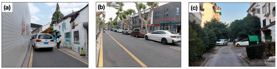 The current situation of urban space in Suzhou old town. (a) Road space in Suzhou old town, (b) roadside parking space in Suzhou old town, (c) residential human settlement environment in Suzhou old town.